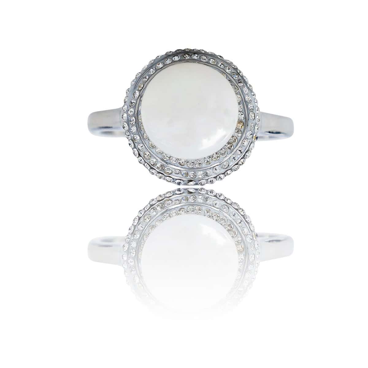 Bague femme ornée oxyde de zirconium et perle de synthèse – La taille indiquée est le périmètre (le tour) de votre doigt en millimètre (mm) – Marque Française – Made in RPC – Matière : Acier – Largeur : 15mm – Livrée avec pochette cadeau