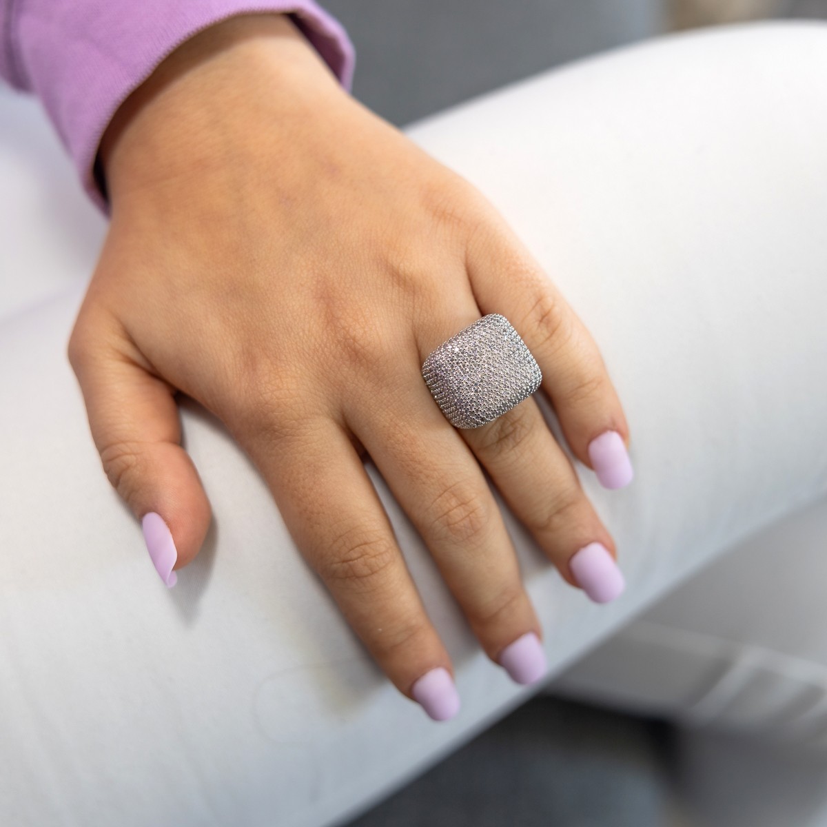– Voilà une belle bague femme qui comblera les fans de bling-bling ! Cette bague a été réalisée avec beaucoup de soin. Elle brille encore et encore. Tout en acier, cette bague possède une centaine de jolis strass en Oxyde de Zirconium blanc