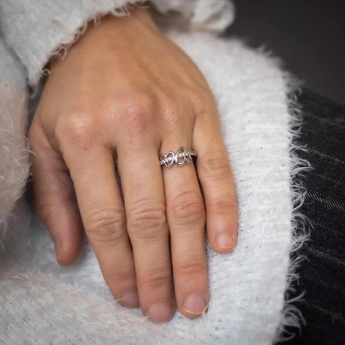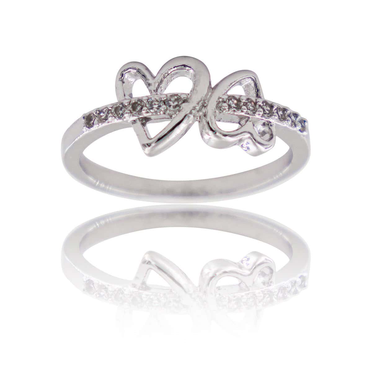 – Voici la bague de l’amour avec ses deux coeurs inserrés dans l’anneau – Cette bague est faite pour symboliser l’amour. Tout en rhodium, elle est ornée de plusieurs strass en Oxyde de Zirconium qui passent à travers les deux coeurs. Cette bague offre une finition très délicate qui n’échappera pas à votre soucis du détailu