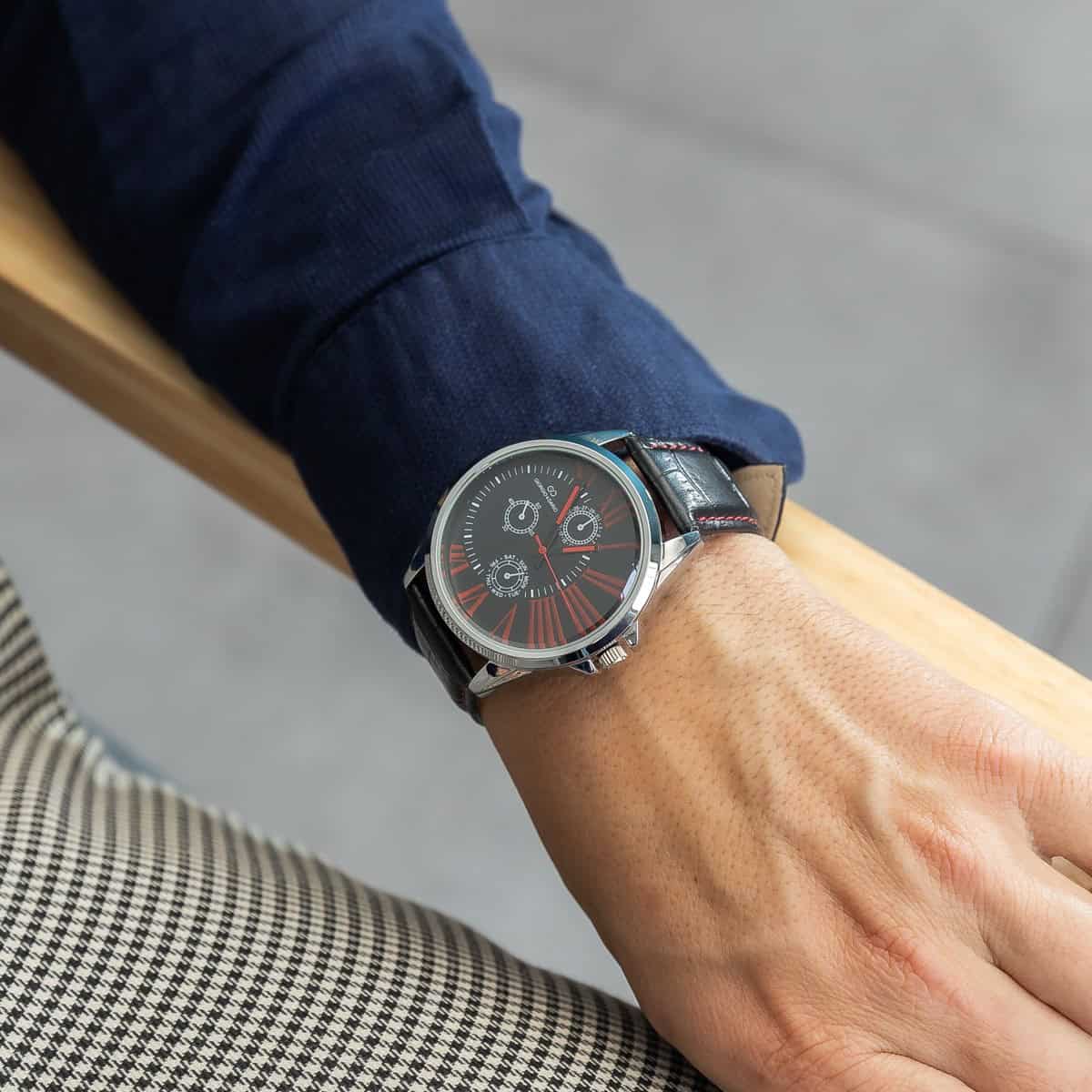 – Cadran : métal orné de trois cadrans factices pour un effet chrono