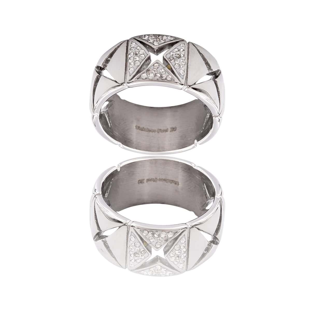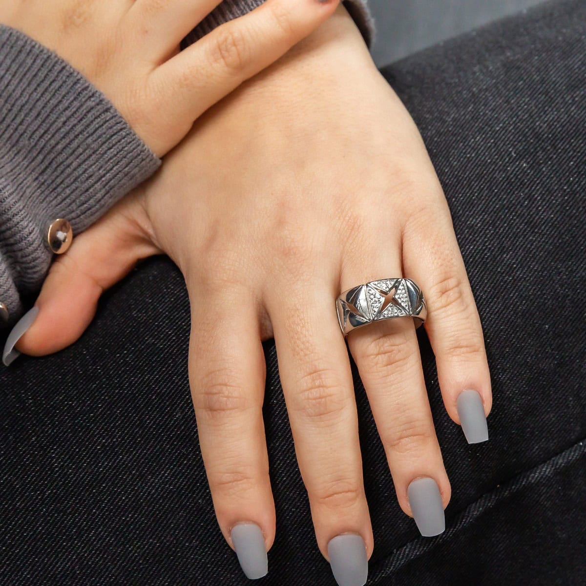 Bague femme ornée oxyde de zirconium – La taille indiquée est le périmètre (le tour) de votre doigt en millimètre (mm) – Marque Française – Made in RPC – Matière : Acier – Largeur : 12mm – Livrée avec pochette cadeau